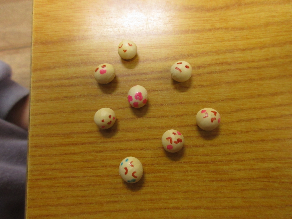 今年は全力部門がギャーギャー叫びながら戦っている間、穏やか部門の子たちがいくつか豆を拾って絵を描いたり丁寧に並べて遊んだりもしていました。